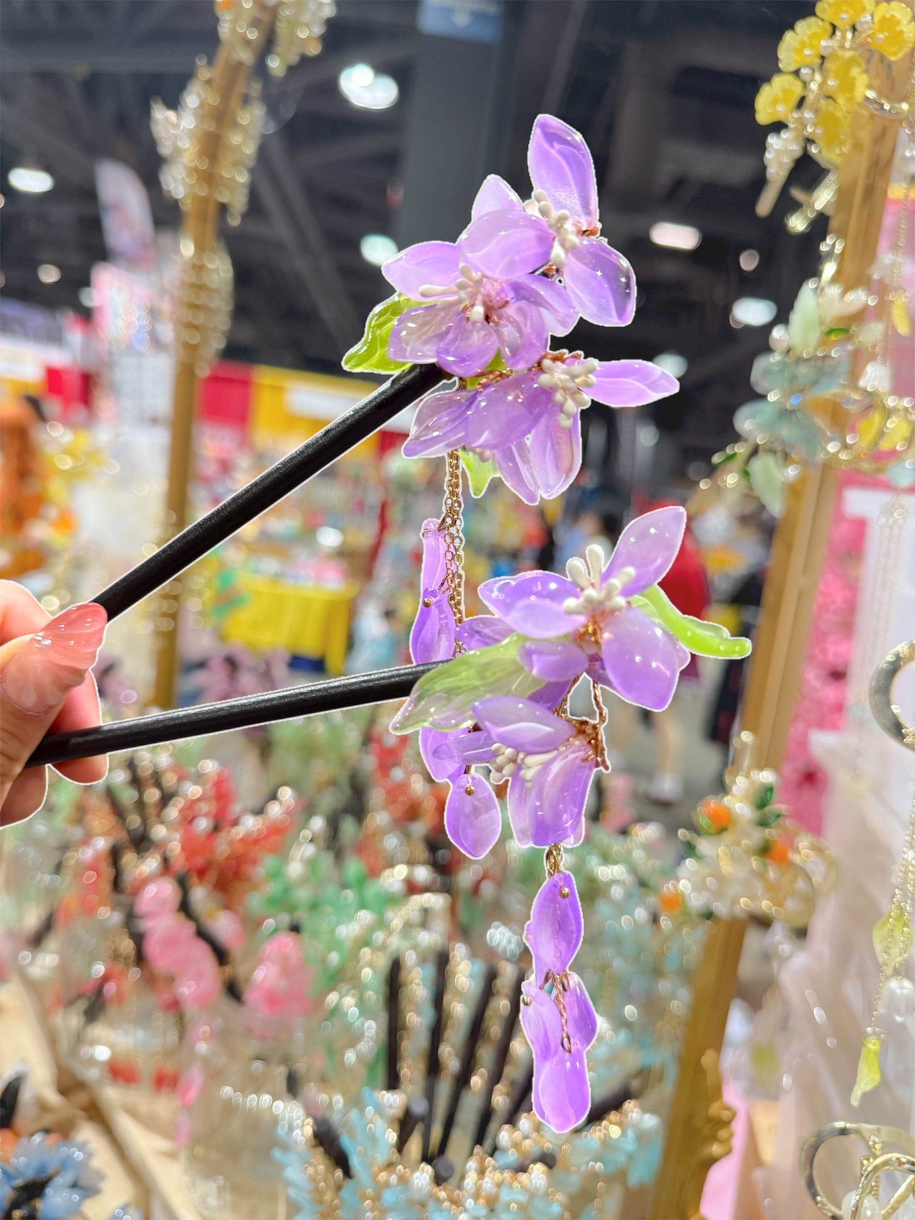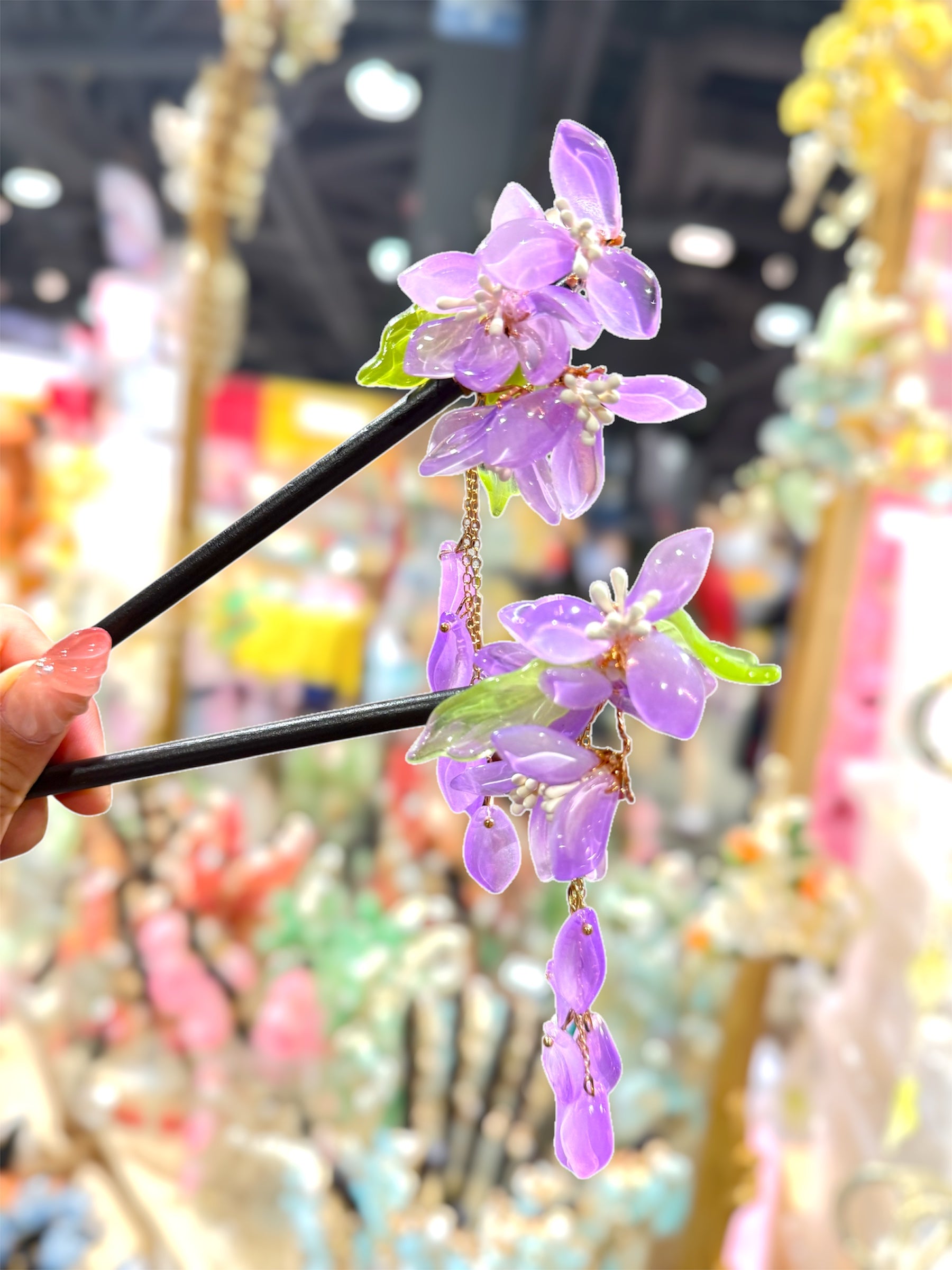 Delicate, ethereal, and romantic, the Wisteria Bloom Hairpin features cascading translucent purple flowers inspired by blooming wisteria vines. Soft green leaf accents and a subtle dangling chain create elegant movement, catching the light beautifully with every step.
